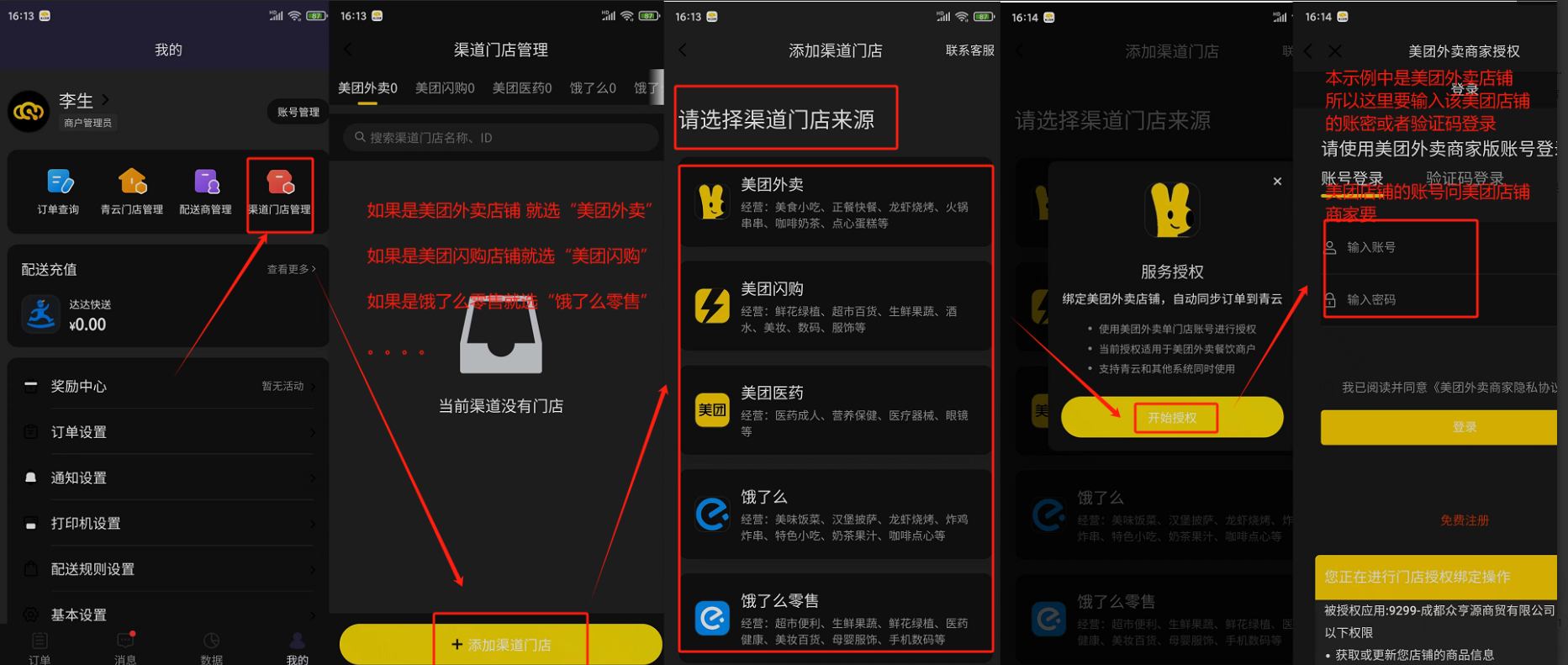 4.商家下载青云聚信app,注册账号,并将美团店铺授权绑定到青云(如果是饿了么店铺也是同样的操作)