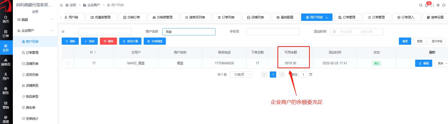 企业商户充值之后,需到跑腿联盟聚合后台手动将订单重新推到跑腿系统