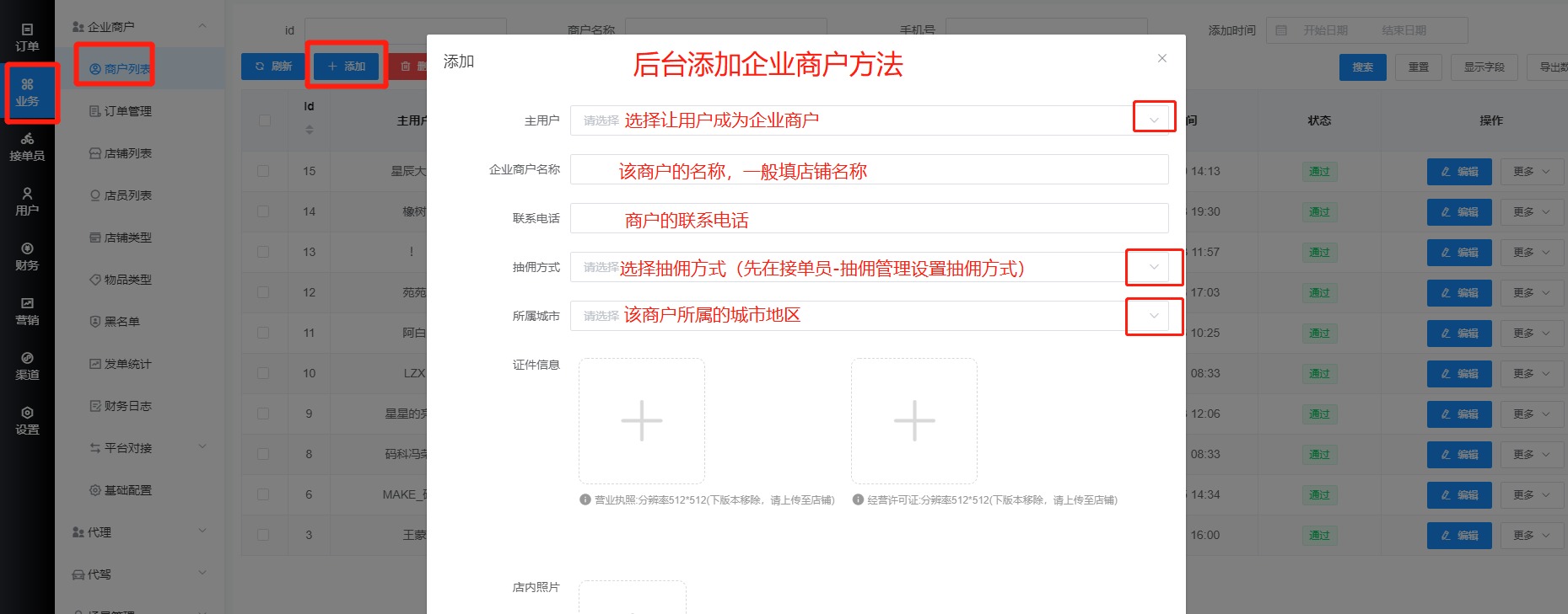 2.直接在后台添加企业商户,方法如下: