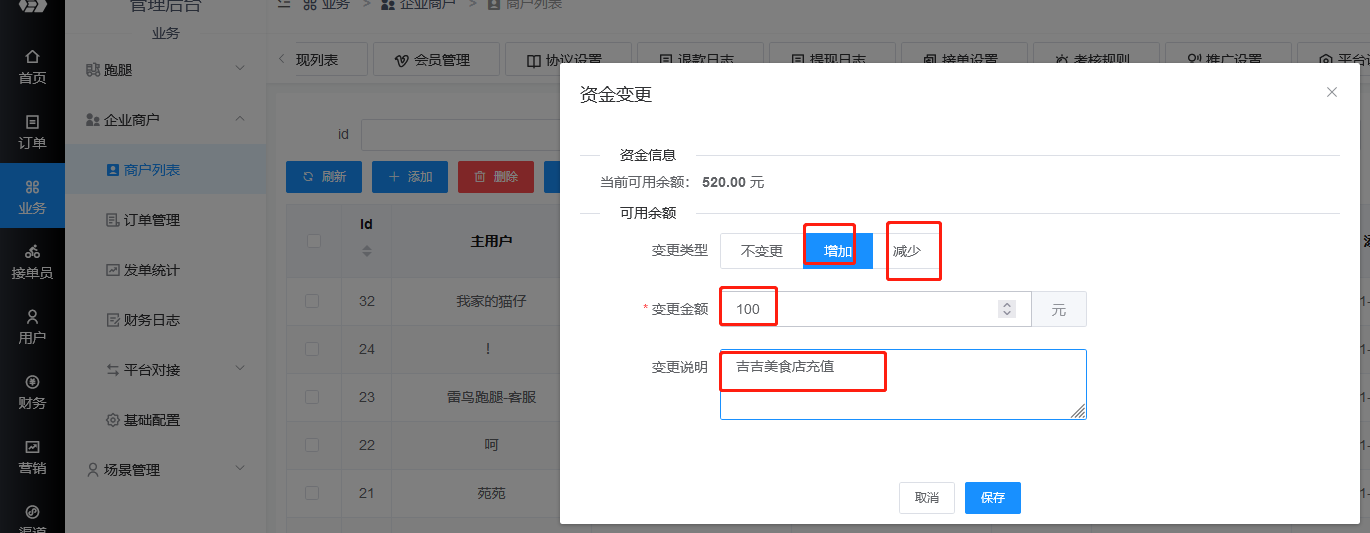 可以后台手动变更(增加或者减少)某个企业商户的余额