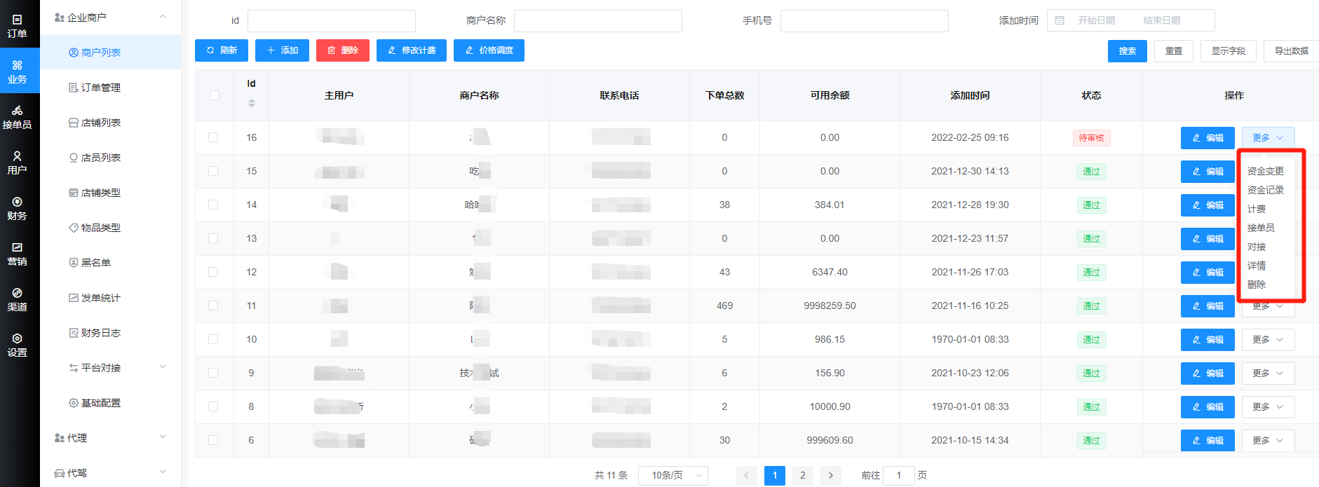 企业商户相关的功能有:资金变更、资金记录、计费、接单员、下面对这些功能进行一一说明